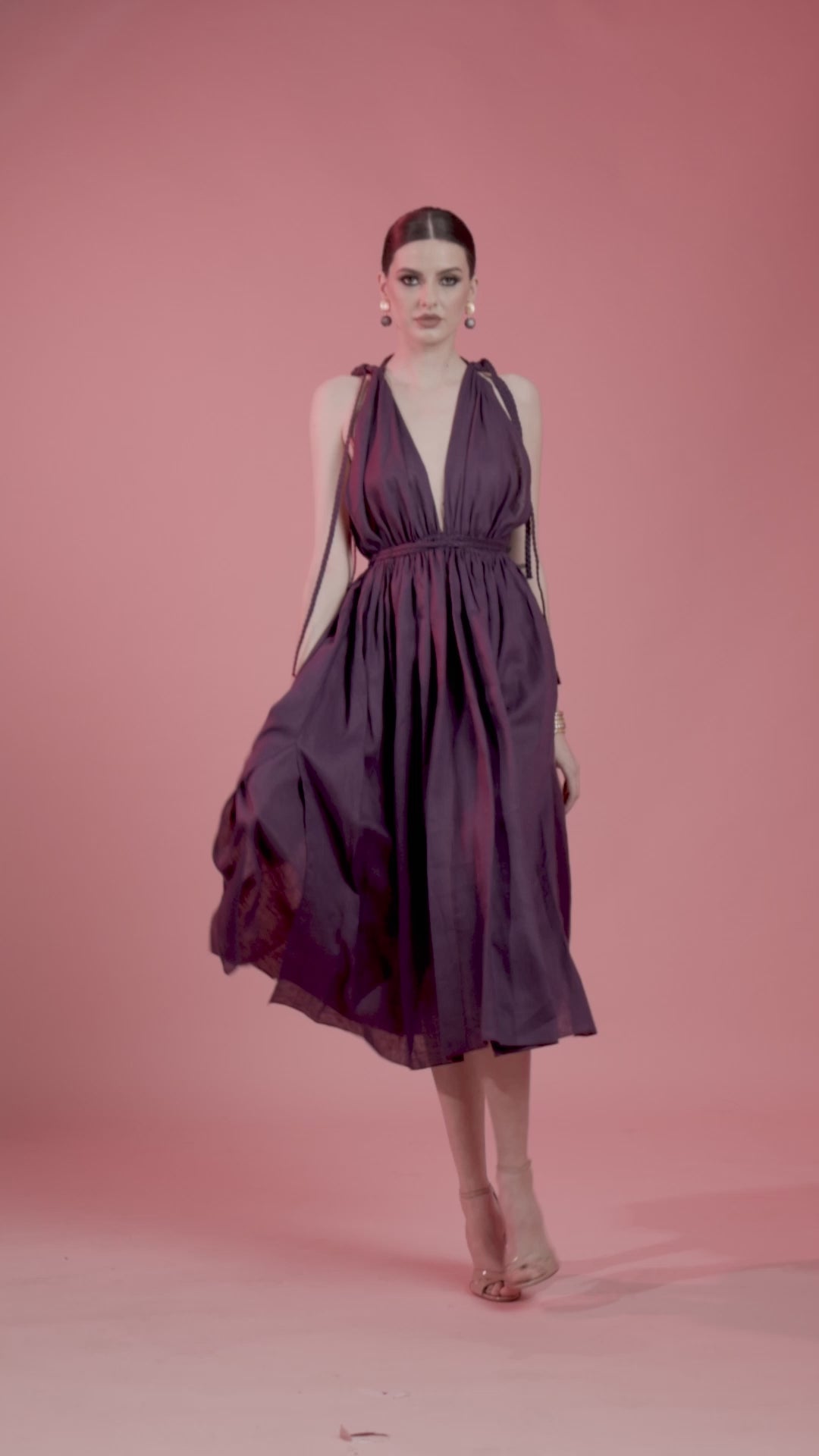 Embrace the allure of amethyst with this fascinating dress! A captivating piece that's designed to make a statement with its rich amethyst shade and graceful halter neckline that accentuates the shoulders.