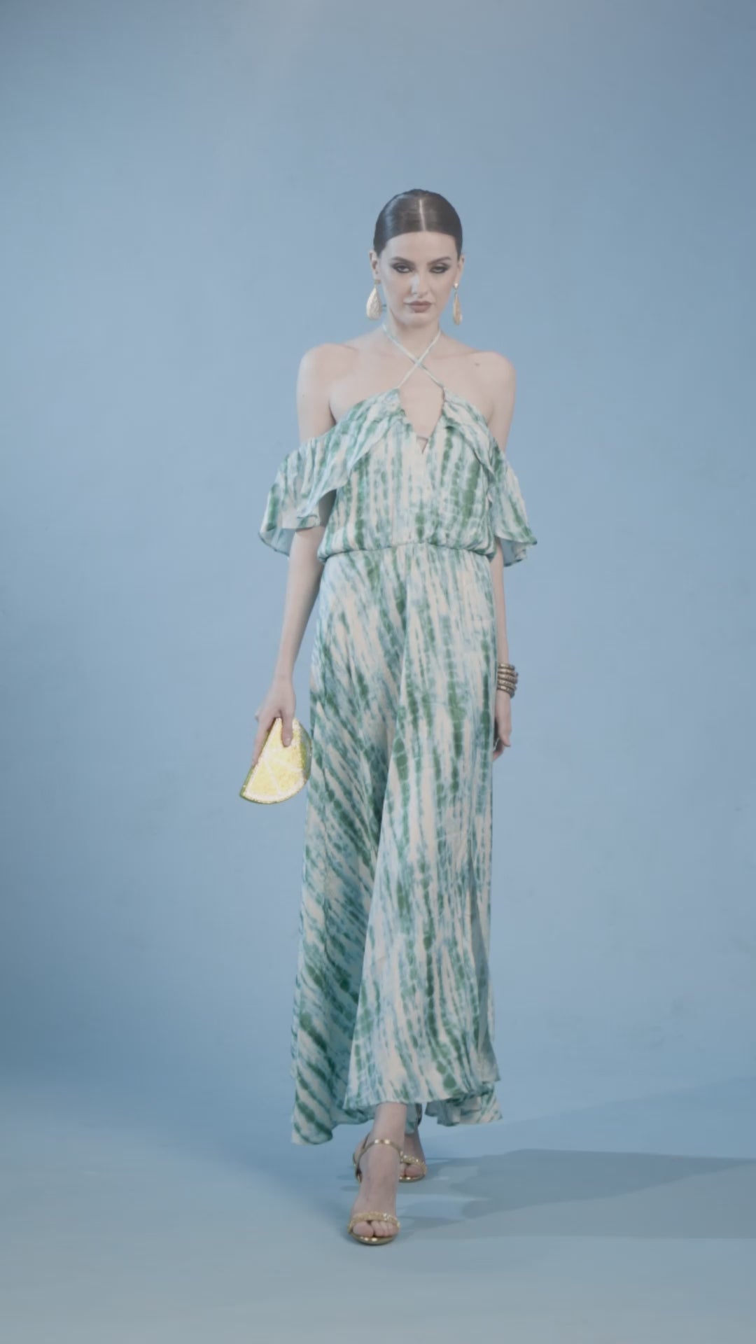 This true, exquisite piece features an aqua and white abstract pattern that evokes the beauty of a lush garden. The off-the-shoulder design adds a touch of allure, gracefully revealing the shoulders and upper back, while a delicate center strap ensures a secure and flattering fit.